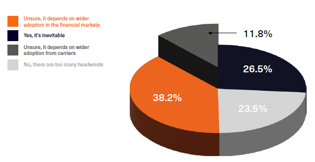 The results aren’t conclusive. Only a quarter – 26.5% – said that they thought it was inevitable and only 11.8% said that no, there are too many headwinds. That leaves approximately two thirds of survey respondents unsure. 23.5% say that adoption by carriers will be a driving force in terms of more widespread adoption, and 38.2% say that adoption by the wider financial markets will be the main driver.